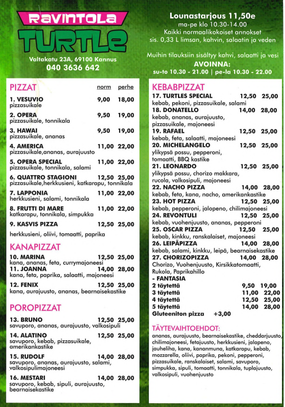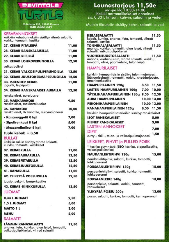 Astu sisään Ravintola Turtleen ja nauti herkkuannoksista! Turtlen valikoimasta löytyy jokaiselle jotakin: pizzoja, kebabeja, hampurilaisia, rullia ja pihvejä. Herkuttele paikan päällä tai nappaa herkut mukaan!
